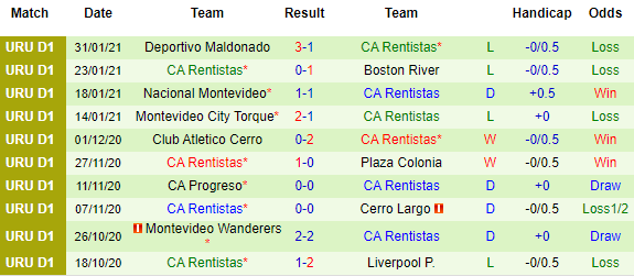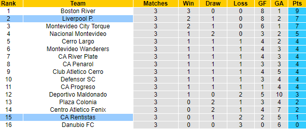 Trong khi đó, Rentistas giai đoạn Apertura thi đấu khá ấn tượng với vị trí thứ 2, nhưng đến giai đoạn Clausura này thì họ lại chơi không tốt. Sau 3 trận Rentistas mới giành được 1 điểm và đứng áp chót trên BXH.