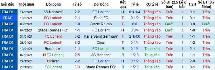 + Thống kê 10 trận gần nhất của Lorient