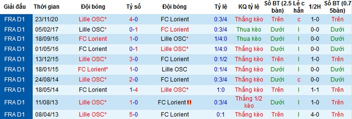 + Lịch sử đối đầu Lorient vs Lille