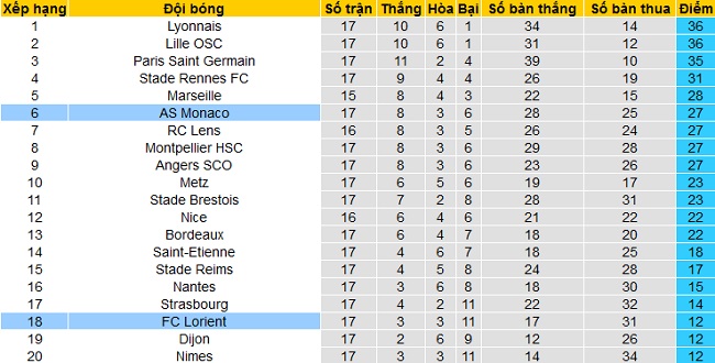 Trong khi đó AS Monaco đang đứng thứ 6 trên bảng xếp hạng với 27 điểm sau 17 vòng đấu. Hiện tại đội bóng chỉ còn cách nhóm các đội có suất dự cúp châu Âu đúng 1 điểm, nhưng kém 2 đội dẫn đầu tới 9 điểm.