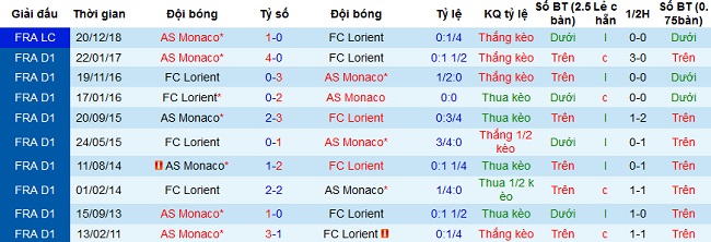 + Soi tỷ lệ kèo châu Á: Mặc dù được chơi trên sân nhà nhưng Lorient vẫn bị đánh giá thấp hơn hẳn đối thủ. Đây cũng không phải điều quá bất ngờ khi ở 10 trận gần nhất đội bóng thua kèo đến 7 trận. Tuy nhiên AS Monaco cũng để thua kèo liên tiếp ở các trận gần đây sau khi có một loạt chuỗi thắng.