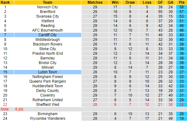 Trên BXH hiện tại, Luton Town đứng thứ 15 trong khi Cardiff có được vị trí thứ 7. Tuy nhiên về điểm số thì Cardiff lại chỉ hơn đối thủ đúng 3 điểm mà hơn nữa thì Luton Town còn đang chơi ít hơn 1 trận. Vậy nên nhìn nhận khách quan thì Cardiff hiện tại chẳng nhỉnh hơn Luton Town là bao.