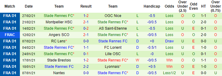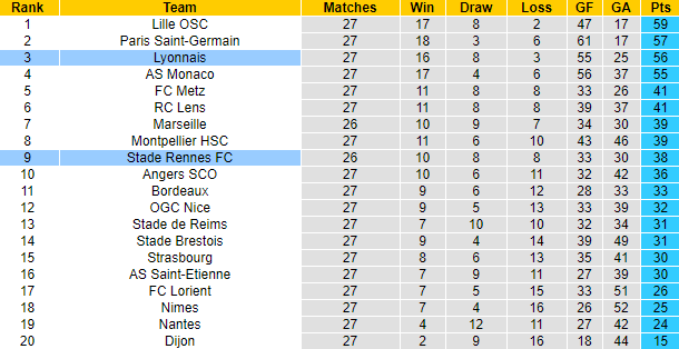 Lý do là bởi Rennes đang sa sút không phanh với 4 trận thua liên tiếp. Xa hơn, 7 trận trước đó Rennes thua 5, hòa 2 và thua 6, hòa 1 theo kèo châu Á. Trên bảng xếp hạng Ligue 1, Rennes đã tụt xuống vị trí thứ 9, bị Top 4 bỏ cách 17 điểm. Trong khi Lyon đang xếp thứ 3 với 56 điểm, hơn Rennes 18 điểm và chỉ kém đội đầu bảng Lille 3 điểm. Trên sân nhà, Lyon xé lưới đối thủ 11 lần chỉ trong vòng 4 trận gần đây.