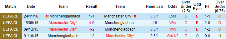 Lần gần nhất làm khách trên sân của M'gladbach, Man City bị cầm hoà với tỷ số 1-1. Đó là trận đấu diễn ra trong khuôn khổ vòng bảng Champions League 2016/17. Đáng chú ý, trước giờ bóng lăn trận đấu đó, Man City chấp -3/4 theo kèo châu Á.