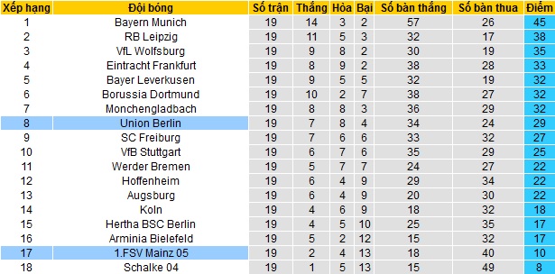 Trong khi đó Union Berlin đang tỏ ra tiến bộ sau mỗi mùa giải kể từ khi được thăng hạng lên chơi tại Bundesliga. Hiện tại đội bóng đang đứng thứ 8 trên bảng xếp hạng với 29 điểm sau 19 vòng đấu, chỉ còn cách nhóm các đội có suất dự cúp châu Âu đúng 3 điểm.