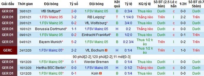 + Thống kê 10 trận gần nhất của Mainz 05