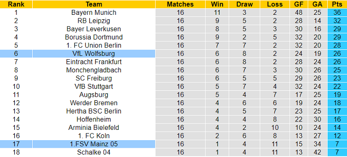 Chạm trán một đối thủ như vậy là cơ hội để Wolfsburg giành trọn 3 điểm. Nên nhớ rằng Wolfsburg toàn thắng cả 3 lần so tài gần nhất với Mainz thuộc khuôn khổ Bundesliga.