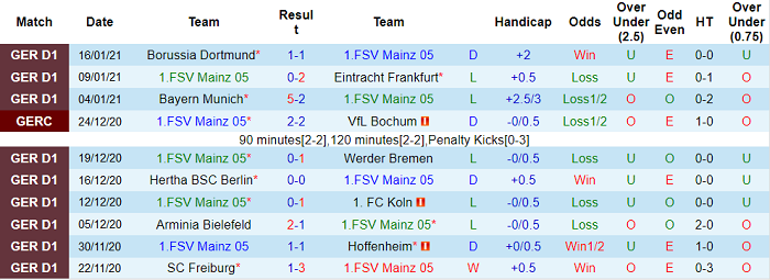 Mainz không có được thành tích tốt kể từ khi Bundesliga 2020/21 khởi tranh. Họ chỉ thu về 7 điểm sau 16 vòng đấu: thắng 1, hòa 4, thua 11. Thành tích của Mainz chỉ hơn mỗi Schalke về chỉ số phụ.