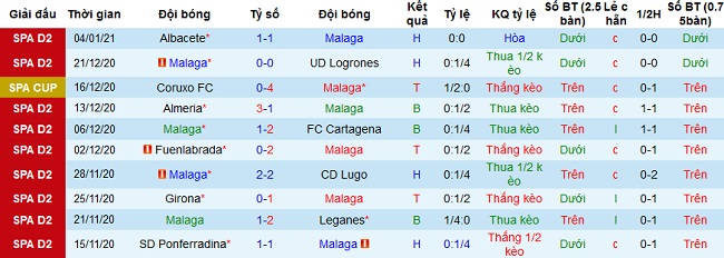 + Thống kê 10 trận gần nhất của Málaga