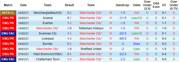 + Thống kê 10 trận gần nhất của Man City