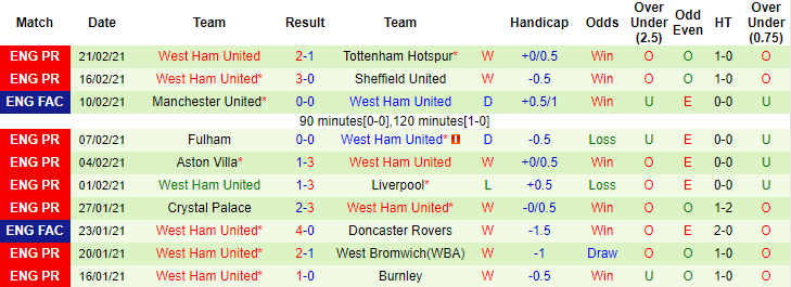 + Thống kê 10 trận gần nhất của West Ham