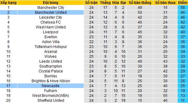 Trong khi đó Newcastle cũng đang thi đấu sa sút ở mùa giải này và hiện đã tụt xuống vị trí thứ 17 của bảng xếp hạng, ngay trên nhóm các đội cầm đèn đỏ. Với 25 điểm có được sau 24 vòng đấu, Newcastle chỉ còn hơn đội bóng đứng sau Fulham đúng 3 điểm tuy đang thi đấu ít hơn 1 trận.