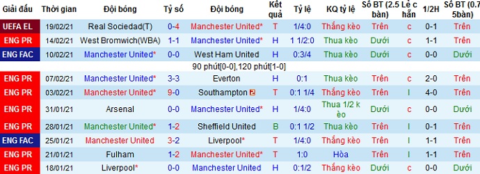 + Thống kê 10 trận gần nhất của Man United