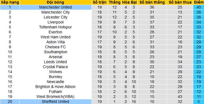 Trái lại Sheffield United đang đứng bét bảng xếp hạng tại giải ngoại hạng khi chỉ có được 5 điểm sau 19 vòng đấu. Hiện tại khoảng cách của Sheffield United với nhóm các đội trụ hạng đã lên tới 12 điểm.
