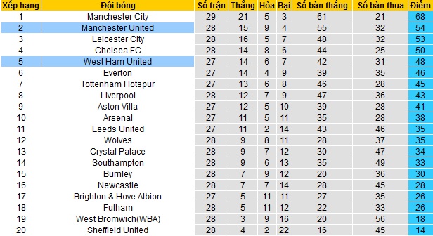 Hiện tại Manchester United đang đứng thứ nhì với 54 điểm, kém đội đầu bảng Man City tới 14 điểm nhưng thi đấu ít hơn 1 trận. Trái lại West Ham đã keo lên vị trí thứ 5 với 48 điểm và chỉ kém đội thứ tư Chelsea 2 điểm và cũng đang thi đấu ít hơn 1 trận.