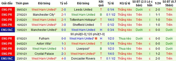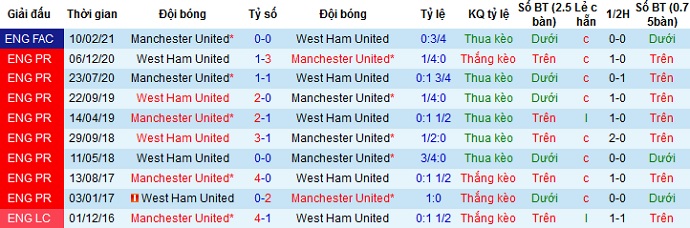 Trong khi đó thành tích của West Ham lại khá thất thường với 3 trận thắng và 2 trận thua ở 5 trận gần nhất. Thành tích sân khách của West Ham cũng chẳng tốt hơn khi không thắng ở 3 trận gần nhất, trong đó để thua trước Man City và thua trước chính Man Utd tại FA Cup bởi bàn thắng trong hiệp phụ.