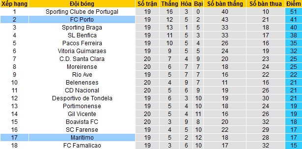 Bảng xếp hạng giải VĐQG Bồ Đào Nha vòng 20