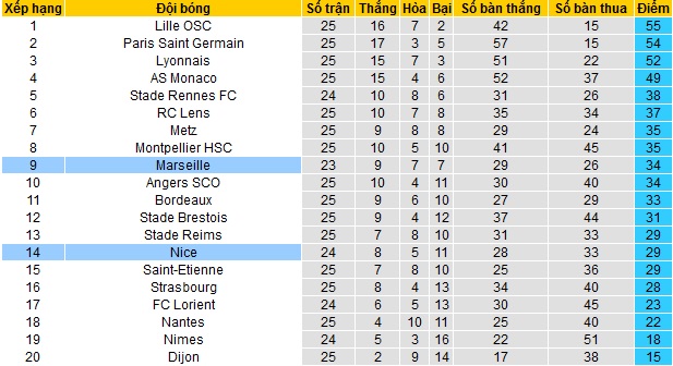 Trong khi đó Nice chỉ đang đứng thứ 14 trên bảng xếp hạng với 29 điểm sau 24 vòng đấu. Hiện tại đội bóng vẫn đang hơn nhóm các đội cầm đèn đỏ tới 7 điểm. Dù sao đây cũng là thành tích có phần sa sút của đội bóng nếu so với vị trí thứ 5 khi kết thúc mùa giải trước.