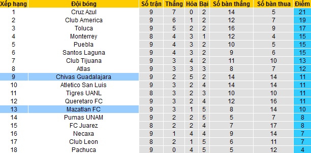 Mazatlán vẫn chư thể thoát khỏi vị trí thứ 13, ngay dưới nhóm các đội có suất dự play-off. Với 10 điểm có được sau 9 vòng đấu, Mazatlán cũng chỉ đang kém các đội trong Top 12 đúng 1 điểm.