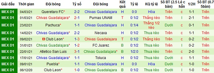 + Thống kê 10 trận gần nhất của Guadalajara