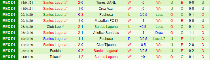 + Thống kê 10 trận gần nhất của Santos Laguna
