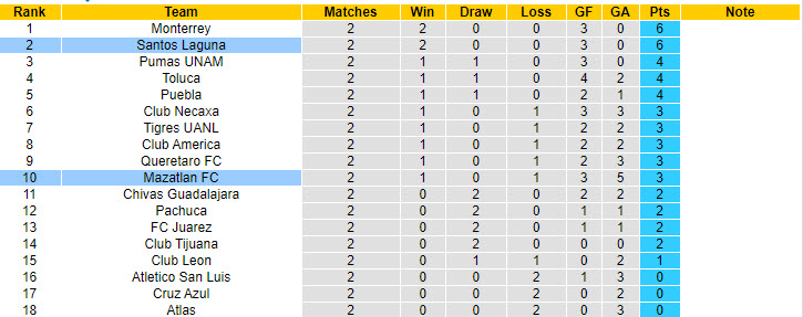 Nhiều khả năng số trận thua của Mazatlan sẽ tiếp tục gia tăng sau lượt trận đêm nay khi họ chạm mặt đội bóng đang vào phom là Santos Laguna. Hiện tại, Santos Laguna đang là đội bóng có phong độ tốt nhất lượt về với 2 trận toàn thắng, ghi 3 bàn và không một lần để thủng lưới.