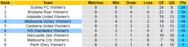 Còn về phía WS Wanderers (W), họ đang có vị trí thứ 6 và kém Melb. Victory tới 4 điểm dù đá nhiều hơn 1 trận. Chỉ có thắng ở cuộc chiến này thì WS Wanderers (W) mới níu kéo hy vọng lọt vào top 4.