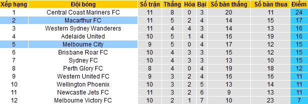 Bảng xếp hạng giải VĐQG Úc trước vòng 12