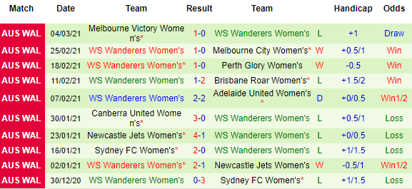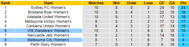 Phía đối diện, WS Wanderers (W) tuy có khá hơn nhưng cũng chưa đủ để vươn lên top có vé vào giai đoạn Final tranh chức vô địch. Hiện tại WS Wanderers (W) còn kém vị trí thứ 4 tới 7 điểm mà lại đá nhiều hơn 1 trận.