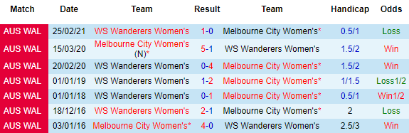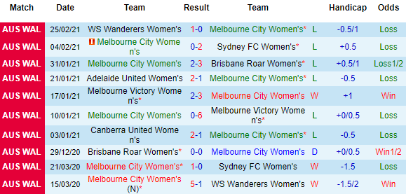 + Lịch sử đối đầu Melbourne City (W) vs WS Wanderers (W)