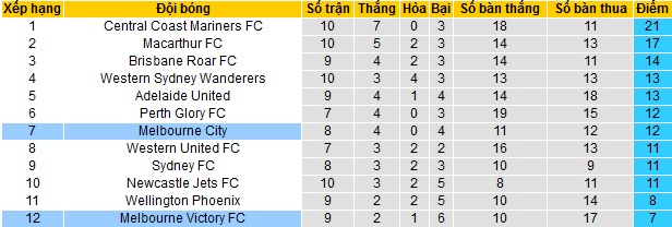 Bảng xếp hạng giải VĐQG Úc vòng 10