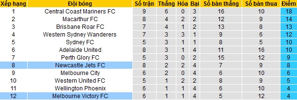 Trong khi đó Newcastle Jets cũng chỉ đang đứng thứ 9 trên bảng xếp hạng. Với 8 điểm sau 8 vòng đấu, Newcastle Jets đang có bằng điểm với đội xếp trên Western United nhưng đã thi đấu nhiều hơn 2 trận và vẫn đang còn cách Top 6 tới 4 điểm.