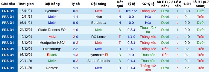 + Thống kê 10 trận gần nhất của Metz