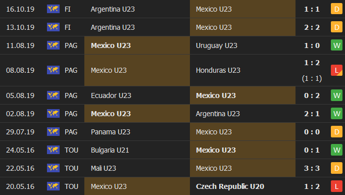 - Thống kê 10 trận gần nhất của Mexico U23