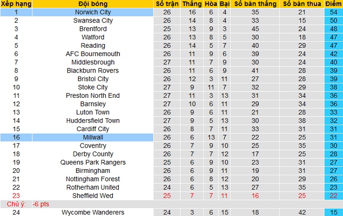 Trong khi đó Norwich City vẫn đang tự tin dẫn đầu bảng xếp hạng với 54 điểm cũng sau 26 vòng đấu. Hiện Norwich đang có nhiều hơn đội nhì bảng Swansea 4 điểm và hơn đội thứ ba Brentford tới 6 điểm.