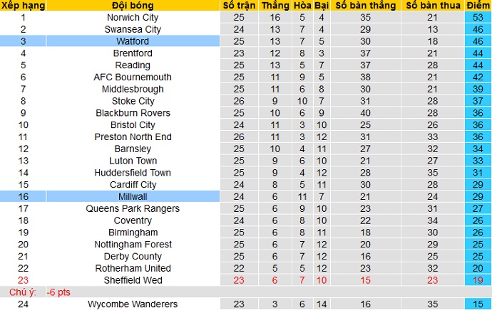 Sau 24 vòng đấu tại giải hạng nhất Anh, Millwall đang có được 29 điểm và chỉ đứng thứ 16 trên bảng xếp hạng. Tuy hiện tại Millwall đang hơn nhóm các đội cầm đèn đỏ 9 điểm nhưng cũng kém các đội trong nhóm có suất dự play-off tới 13 điểm.