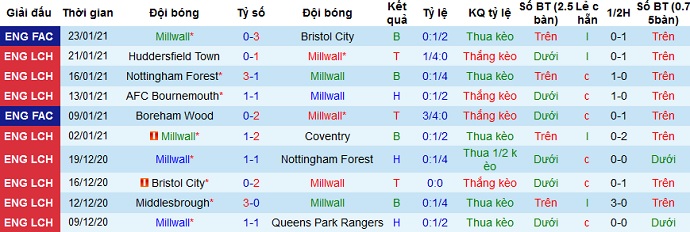 Trong 5 trận gần nhất Millwall có được 2 trận thắng, 1 trận hòa và 2 trận thua bao gồm cả 1 trận thắng và 1 trận thua tại FA Cup. Tuy nhiên nếu chỉ tính riêng tại giải hạng nhất, thành tích của Millwall còn tệ hơn với 1 trận thắng, 2 trận hòa và 2 trận thua. Ngay cả trên sân nhà Millwall đã không thắng 8 vòng đấu gần nhất với 5 trận hòa và 3 trận thua.
