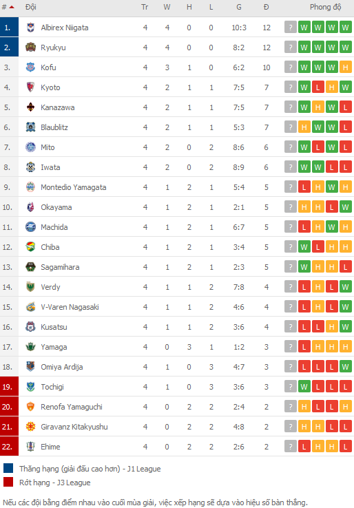 BẢNG XẾP HẠNG Hạng 2 Nhật Bản
