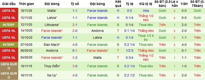 Trong 5 trận gần nhất Đảo Faroe có được 1 trận thắng, 3 trận hòa và để thua 1 trận. Trước đó Đảo Faroe cũng đã từng thắng 2 trận liên tiếp khi bắt đầu mùa giải tại Nations League.