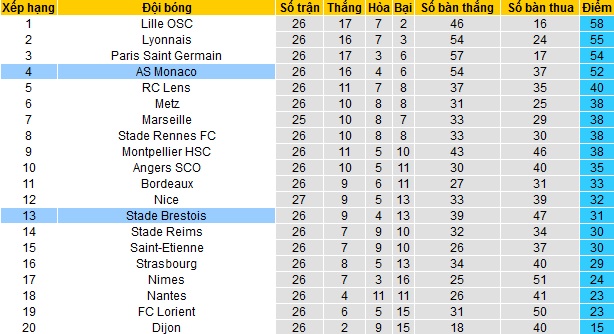 Trong khi đó Brest chỉ đang đứng thứ 13 trên bảng xếp hạng với 31 điểm sau 26 vòng đấu. Khoảng cách 8 điểm của đội bóng đến nhóm cầm đèn đỏ là khá an toàn nhưng hiện tai Brest cũng đang kém nhóm các đội có suất dự cúp châu Âu tới 9 điểm.