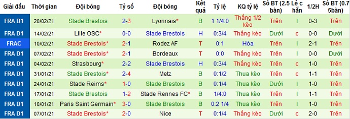 + Thống kê 10 trận gần nhất của Brest