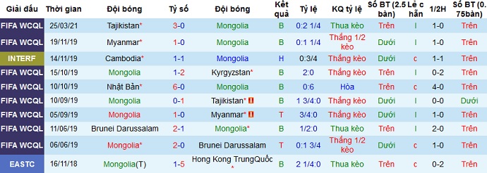 + Thống kê 10 trận gần nhất của Mông Cổ
