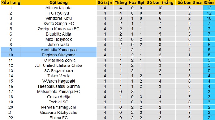 Cả hai đội cùng đang có được 5 điểm sau 4 vòng đấu đầu tiên, không những thế cùng đang có hiệu số bàn thắng là +1.Khác biệt duy nhất là Montedio Yamagata đã có được 5 bàn thắng trong khi Fagiano Okayama mới chỉ có 2 bàn sau 4 trận đã đấu.