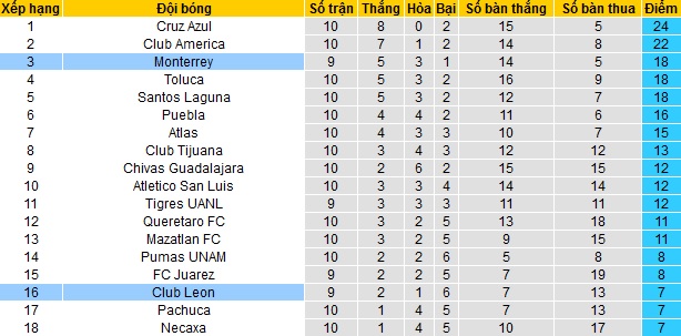 Bảng xếp hạng giải VĐQG Mexcio vòng 10