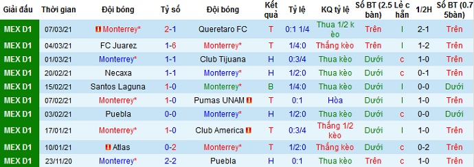 Ở 5 trận gần nhất Monterrey có được 2 trận thắng, hòa 2 và để thua 1. Trên sân nhà thành tích của đội bóng tốt hơn rất nhiều khi bất bại ở 6 trận gần đây với 4 trận thắng và 2 trận hòa, trong đó thắng 3 và hòa 1 kể từ khi bắt đầu giai đoạn lượt về.