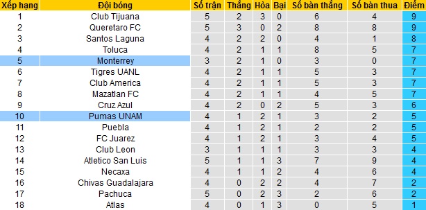 Bảng xếp hạng giải VĐQG Mexico vòng 5