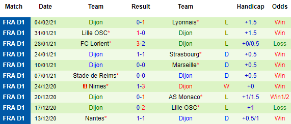 Dijon đang lẹt đẹt ở nhóm cuối và xếp áp chót với chỉ 15 điểm. Hy vọng trụ hạng với họ ngày càng ít đi khi Dijon toàn thua 3 vòng gần nhất. Nếu không kịp cải thiện tình hình, khả năng Dijon phải xuống Ligue 2 sau khi mùa này khép lại là rất cao.