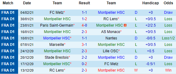Từng có thời điểm Montpellier thuộc nhóm đầu của Ligue 1 và có cửa tranh vé dự Cúp châu Âu. Nhưng bất ngờ là từ giữa tháng 12/2020, Montpellier sa sút và trải qua 9 vòng liên tiếp chỉ biết hòa với thua. Mạch kết quả đáng buồn đó đẩy Montpellier xuống khu vực giữa BXH.