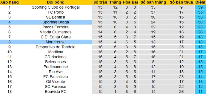Bảng xếp hạng giải VĐQG Bồ Đào Nha trước vòng 16