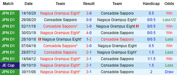 + Lịch sử đối đầu Nagoya Grampus vs Consadole Sapporo